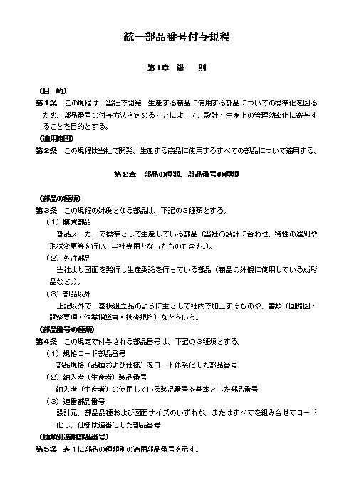 第1条 この規程は、当社で開発、生産する商品に使用する部品についての標準化を図るため、部品番号の付与方法を定めることによって、設計・生産上の管理効率化に寄与することを目的とする。