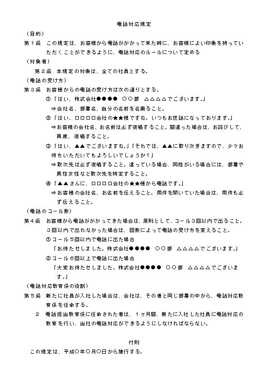第1条 この規定は、お客様から電話がかかって来た時に、お客様によい印象を持っていただくことができるように、電話対応のルールについて定める