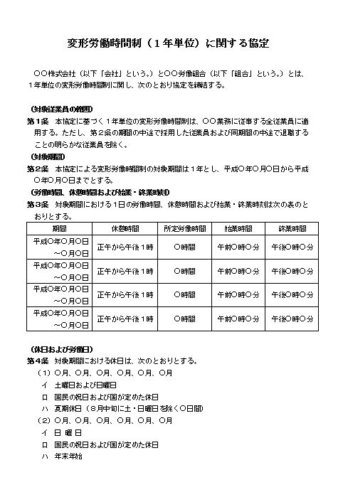 第2条 本協定による変形労働時間制の対象期間は1年とし、平成○年○月○日から平成○年○月○日までとする。