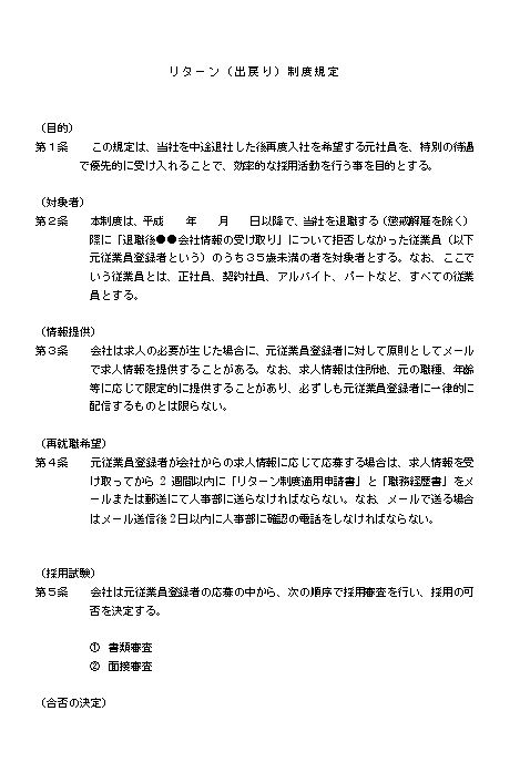 第1条 この規定は、当社を中途退社した後再度入社を希望する元社員を、特別の待遇で優先的に受け入れることで、効率的な採用活動を行う事を目的とする。