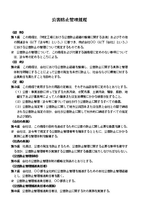 第1条 この規程は、「特定工場における公害防止組織の整備に関する法律」およびその他の関連法令(以下「法令等」という。)に基づき、株式会社○○(以下「会社」という。)における公害防止の管理について規定するものである。
