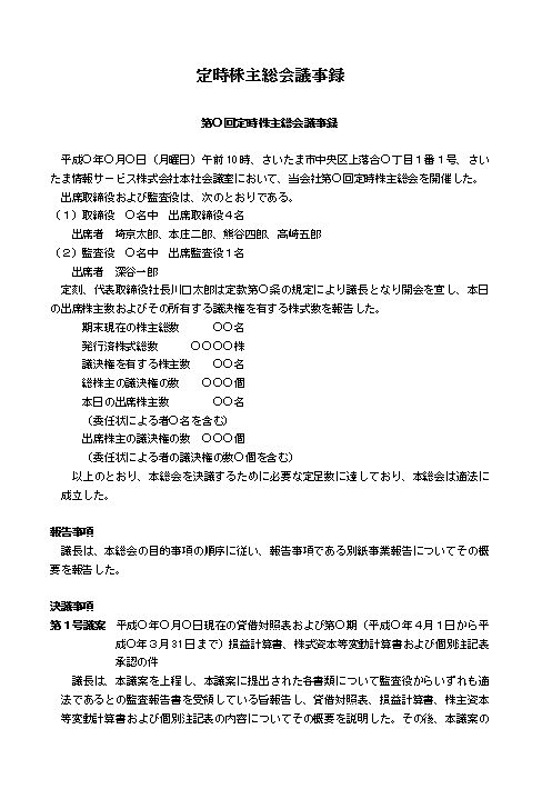 平成○年○月○日(月曜日)午前10時、さいたま市中央区上落合○丁目1番1号、さいたま情報サービス株式会社本社会議室において、当会社第○回定時株主総会を開催した。
