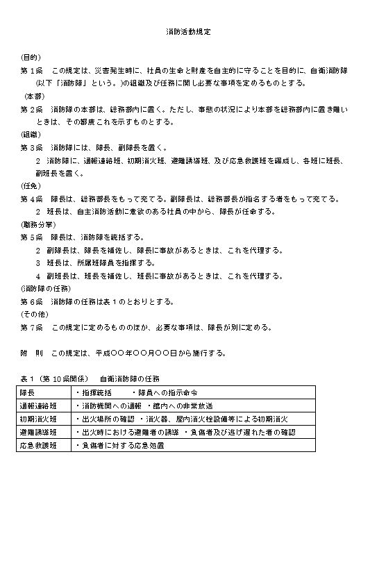 第1条 この規定は、災害発生時に、社員の生命と財産を自主的に守ることを目的に、自衛消防隊(以下「消防隊」という。)の組織及び任務に関し必要な事項を定めるものとする。