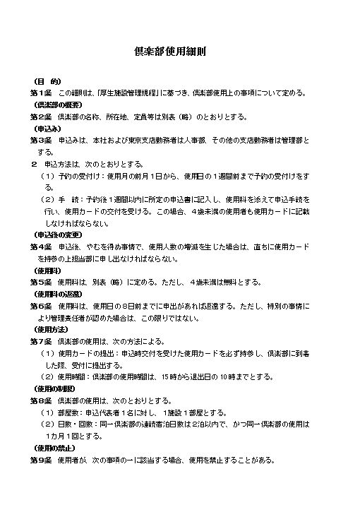 第1条 この細則は、「厚生施設管理規程」に基づき、倶楽部使用上の事項について定める。