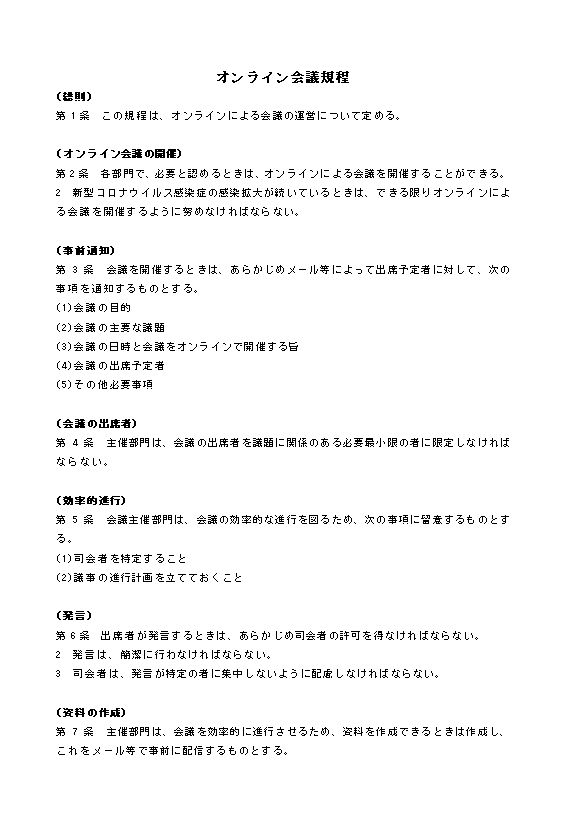 第1条 この規程は、オンラインによる会議の運営について定める。