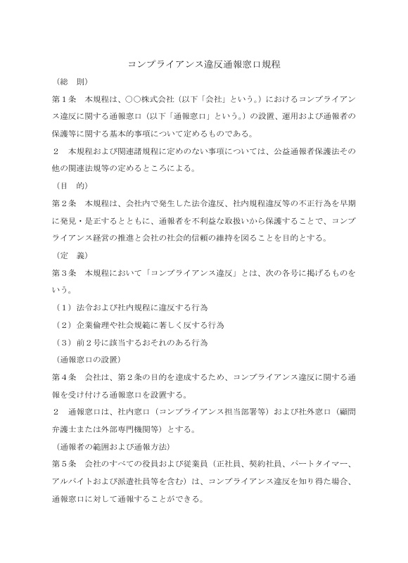 第1条 本規程は、○○株式会社(以下「会社」という。)におけるコンプライアンス違反に関する通報窓口(以下「通報窓口」という。)の設置、運用および通報者の保護等に関する基本的事項について定めるものである。