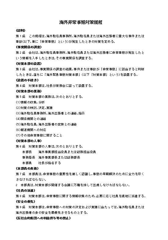 第1条 この規程は,海外駐在員事務所,海外駐在員または海外出張者に重大な事件または事故(以下,単に「非常事態」という)が発生したときの対策を定める。