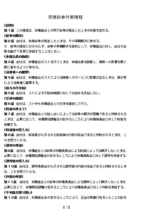 第1条 この規程は、労働組合との問で紛争が発生したときの対策を定める。