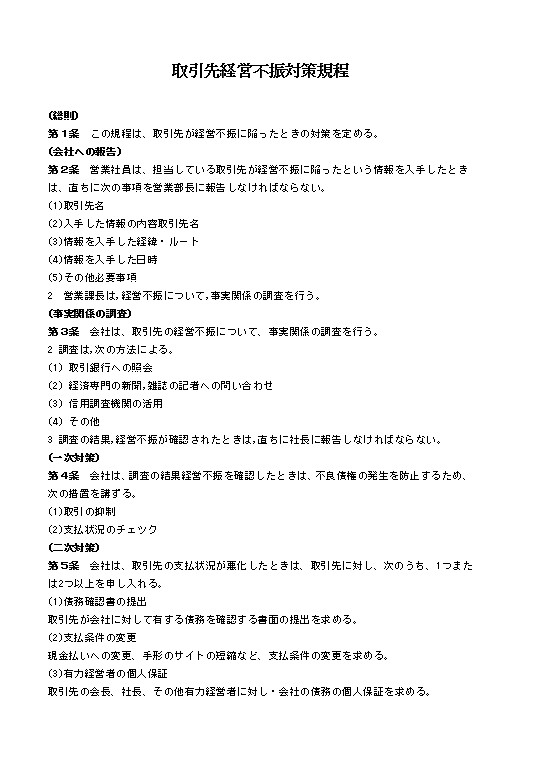 第1条 この規程は、取引先が経営不振に陥ったときの対策を定める。