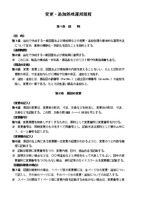 第1条 当社で作成する一般図面および規格類などの変更・追加処理の基本的な運用方法について定め、業務の標準化・効率化を図ることを目的とする。