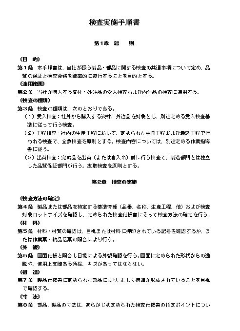 第1条 本手順書は、当社が扱う製品・部品に関する検査の共通事項について定め、品質の保証と検査役務を能率的に遂行することを目的とする。