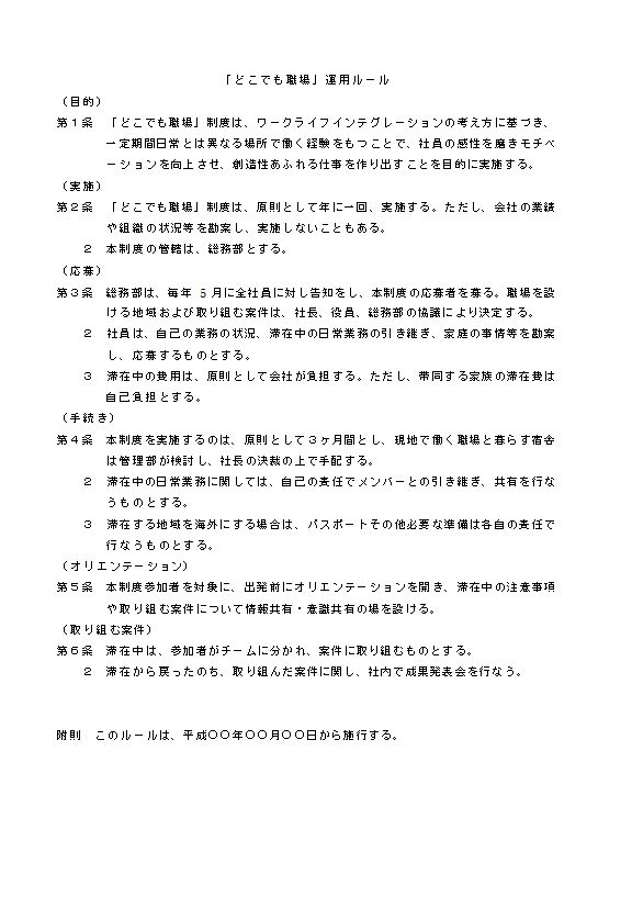 第2条 「どこでも職場」制度は、原則として年に一回、実施する。ただし、会社の業績や組織の状況等を勘案し、実施しないこともある。