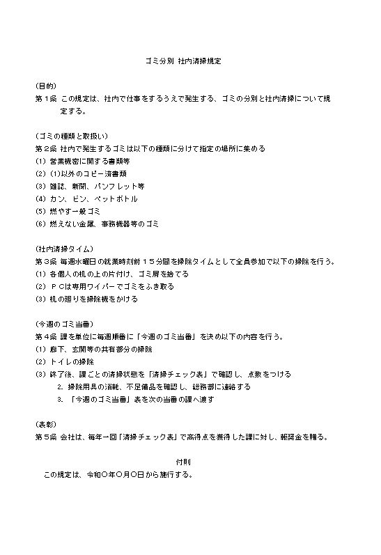 第1条 この規定は、社内で仕事をするうえで発生する、ゴミの分別と社内清掃について規定する。
