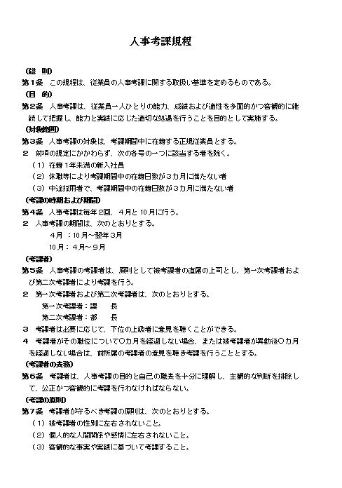 第1条 この規程は、従業員の人事考課に関する取扱い基準を定めるものである。