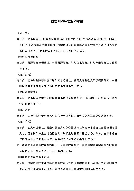 第1条 この規程は、勤労者財産形成促進法に基づき、○○株式会社(以下、「会社」という。)の従業員の財産形成、住宅取得及び退職後の生活安定のために積み立てる貯蓄(以下、「財形貯蓄」という。)について定める。