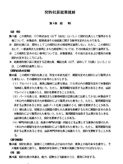 第1条 この規則は、○○株式会社(以下「会社」という。)に契約社員として雇用される者について、労働条件、服務規律その他就業に関する事項を定めたものである。