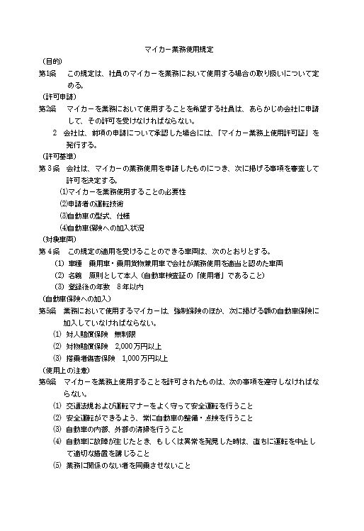 第1条 この規定は、社員のマイカーを業務において使用する場合の取り扱いについて定める。