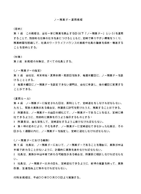 第1条 この規程は、全社一斉に残業を禁止する日(以下「ノー残業デー」という)を運用することで、効率的な仕事の仕方を身につけるとともに、定時で帰りやすい環境をつくり、残業時間を短縮して、社員のワークライフバランスの実現や社員の健康を保持・増進することを目的とする。
