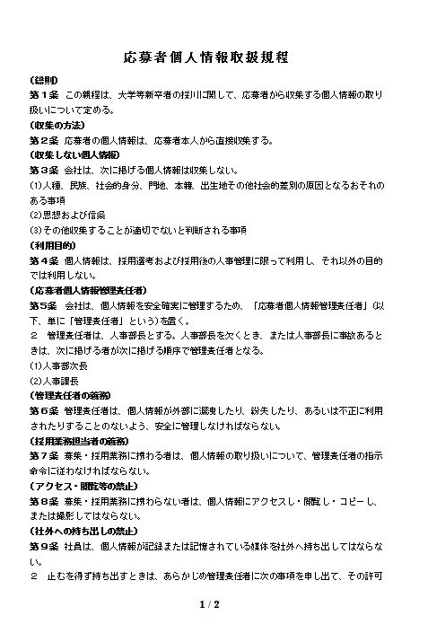 第1条 この親程は、大学等新卒者の採川に関して、応募者から収集する個人情報の取り扱いについて定める。