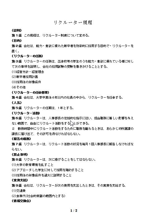 第2条 会社は、能力・意欲に優れた新卒者を効率的に採用する目的で・リクルーターを置く。