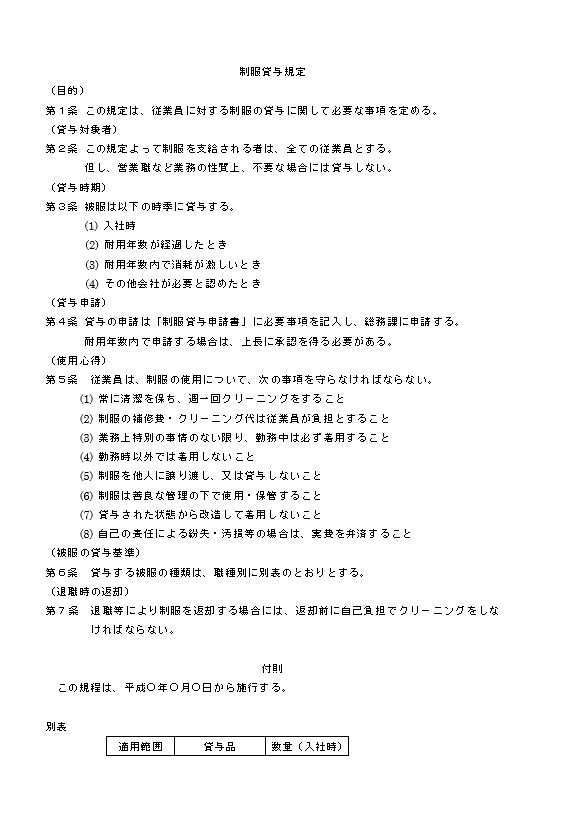 第1条 この規定は、従業員に対する制服の貸与に関して必要な事項を定める。