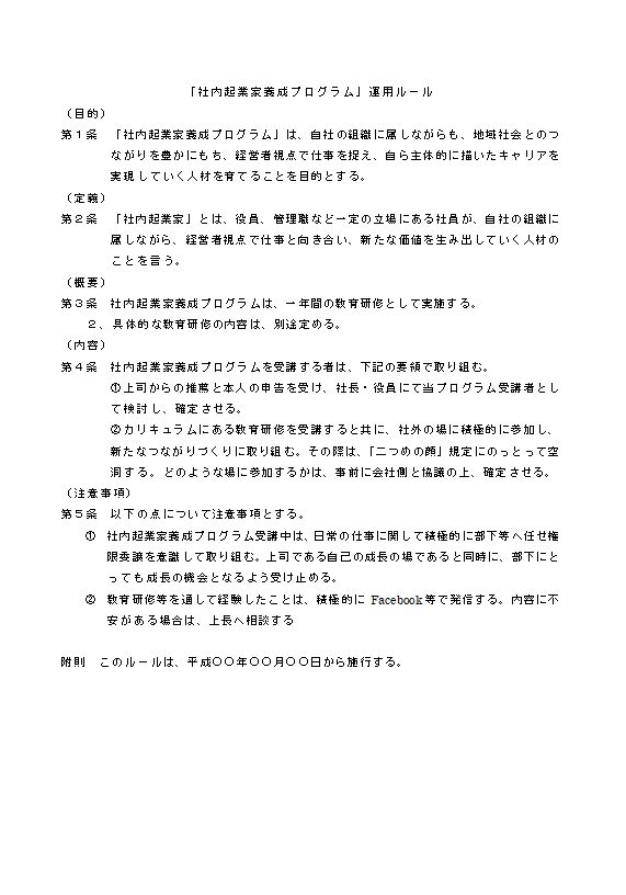 第1条 「社内起業家養成プログラム」は、自社の組織に属しながらも、地域社会とのつながりを豊かにもち、経営者視点で仕事を捉え、自ら主体的に描いたキャリアを実現していく人材を育てることを目的とする。