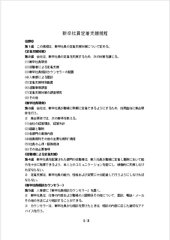 第1条 この規程は、新卒社員の定着支援対策について定める。