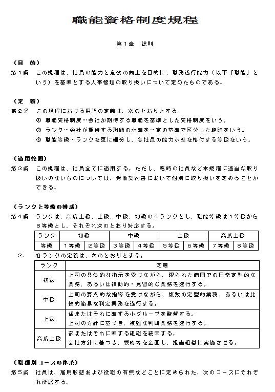第1条 この規程は、社員の能力と意欲の向上を目的に、職務遂行能力(以下「職能」という)を基準とする人事管理の取り扱いについて定めたものである。