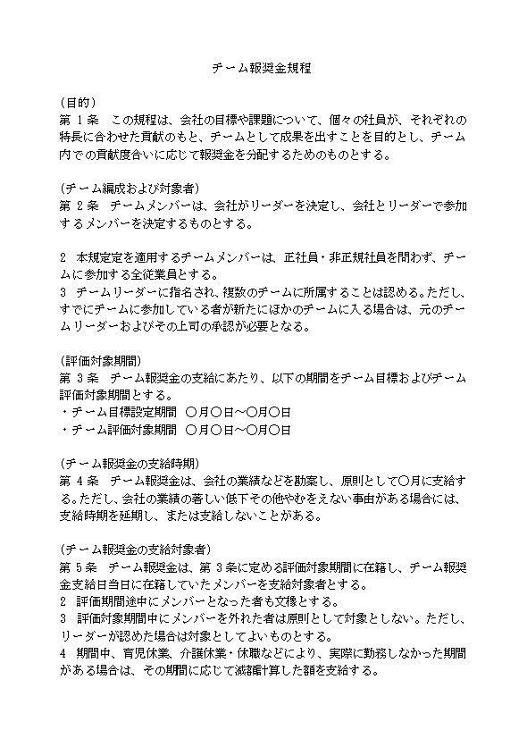 第1条 この規程は、会社の目標や課題について、個々の社員が、それぞれの特長に合わせた貢献のもと、チームとして成果を出すことを目的とし、チーム内での貢献度合いに応じて報奨金を分配するためのものとする。
