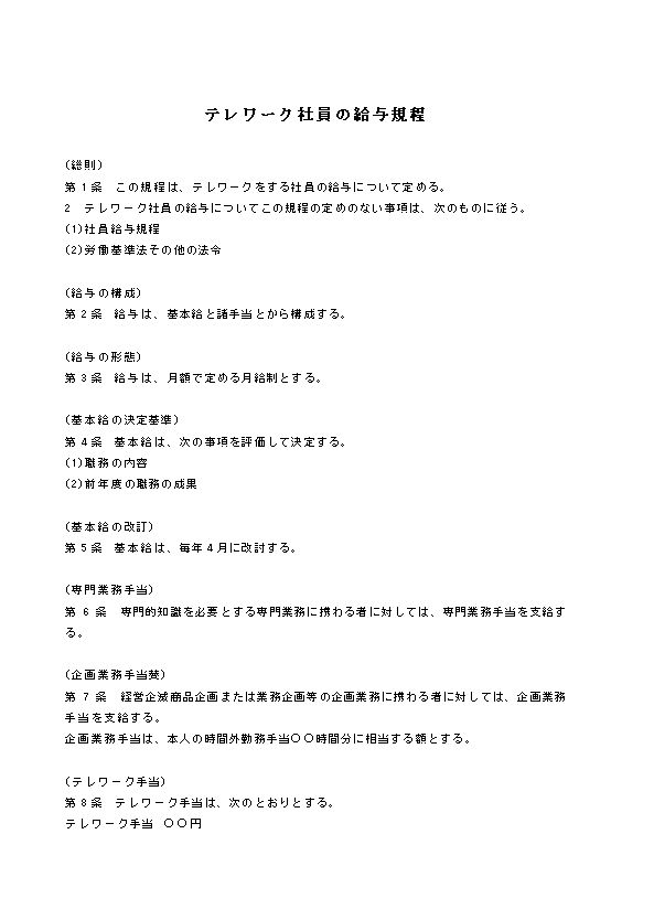 第1条 この規程は、テレワークをする社員の給与について定める。