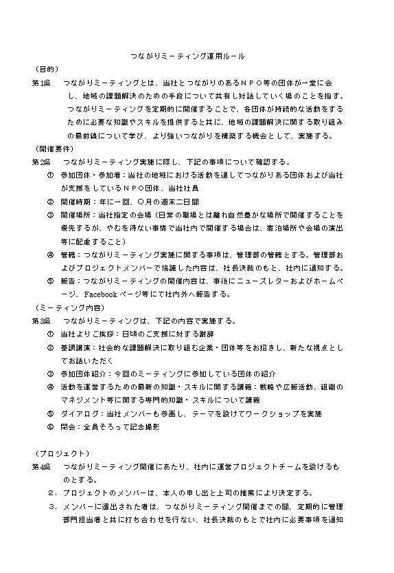 第1条 つながりミーティングとは、当社とつながりのあるNPO等の団体が一堂に会