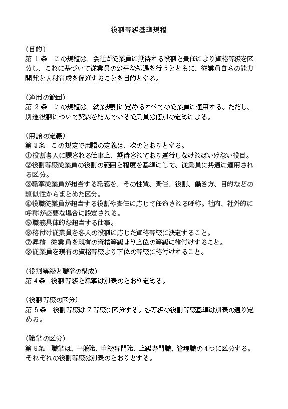 第1条 この規程は、会社が従業員に期待する役割と責任により資格等級を区分し、これに基づいて従業員の公平な処遇を行うとともに、従業員自らの能力開発と人材育成を促進することを目的とする。