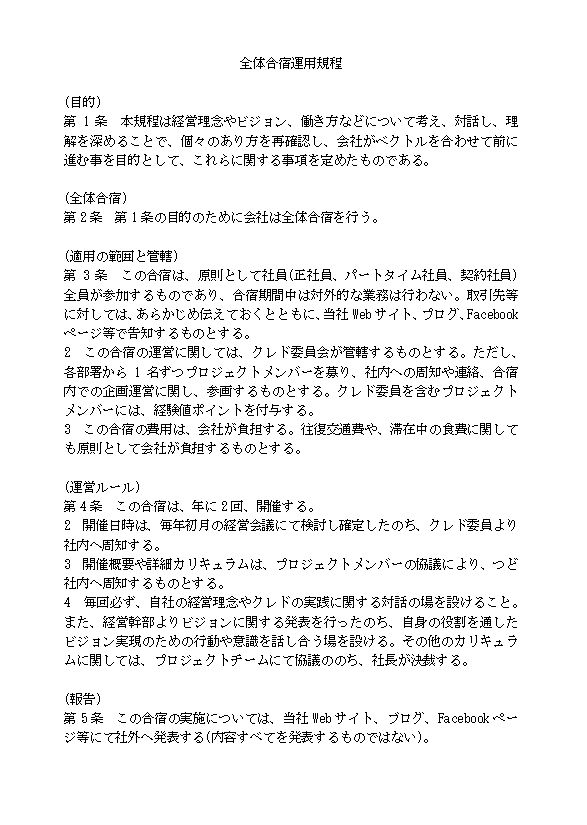 第3条 この合宿は、原則として社員(正社員、パートタイム社員、契約社員)全員が参加するものであり、合宿期間中は対外的な業務は行わない。取引先等に対しては、あらかじめ伝えておくとともに、当社Webサイト、プログ、Facebookページ等で告知するものとする。