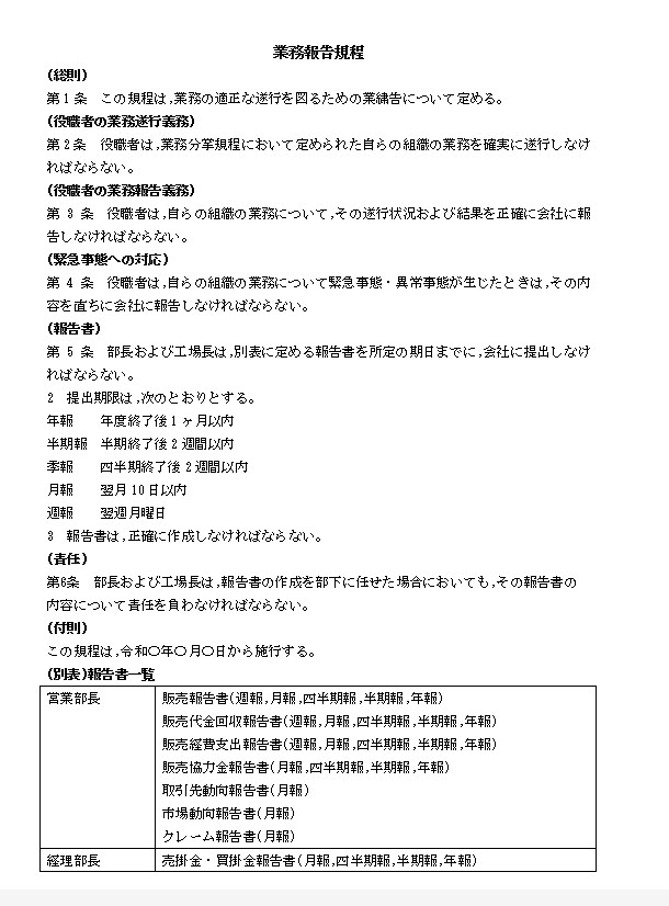 第5条 部長および工場長は,別表に定める報告書を所定の期日までに,会社に提出しなければならない。
