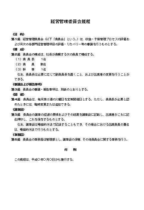 第1条 経営管理委員会(以下「委員会」という。)は、収益・予算管理プロセスの評価および月次の各部門経営管理項目の評価・リカバリー等の審議を行うものとする。