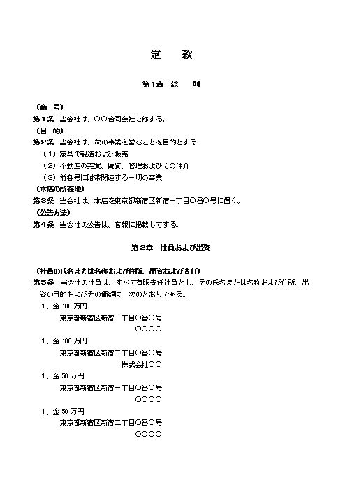 第5条 当会社の社員は、すべて有限責任社員とし、その氏名または名称および住所、出資の目的およびその価額は、次のとおりである。