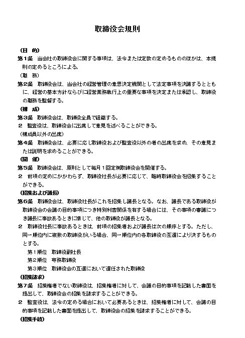 第1条 当会社の取締役会に関する事項は、法令または定款の定めるもののほかは、本規則の定めるところによる。