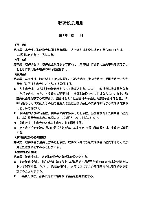 第1条 当会社の取締役会に関する事項は、法令または定款に規定するもののほかは、この規則に定めるところによる。