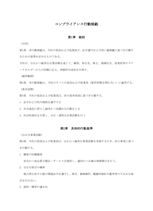 第1条 本行動規範は、当社の役員および従業員が、法令遵守および高い倫理観に基づき行動するための基準を定めるものである。