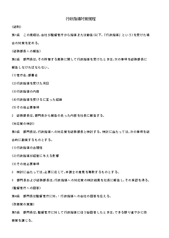 第1条 この規程は,会社が監督官庁から指導または勧告(以下,「行政指導」という)を受けた場合の対策を定める。