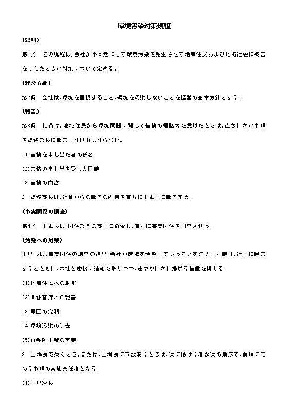 第1条 この規程は,会社が不本意にして環境汚染を発生させて地域住民および地域社会に被害を与えたときの対策について定める。