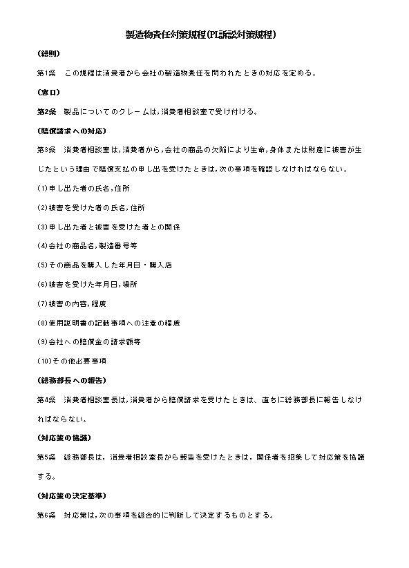 第1条 この規程は消費者から会社の製造物責任を問われたときの対応を定める。