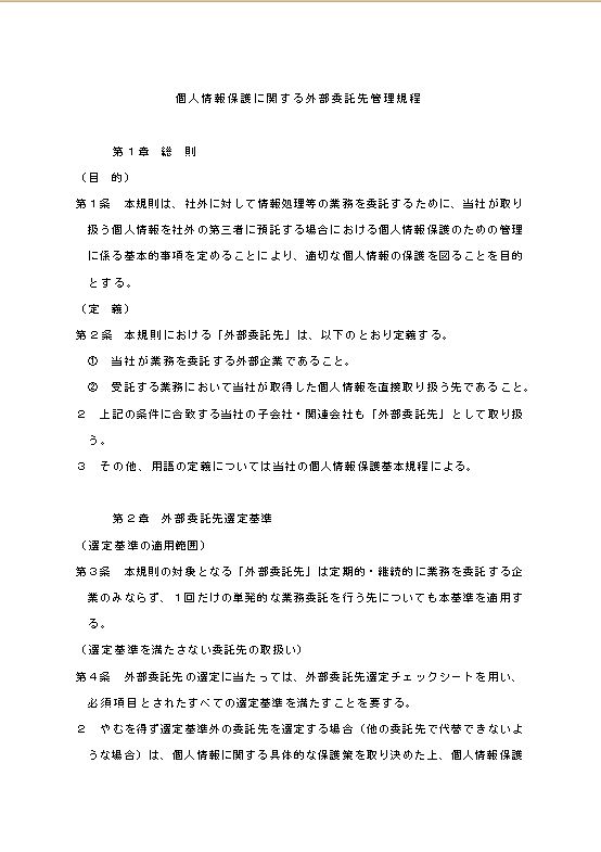 第1条 本規則は、社外に対して情報処理等の業務を委託するために、当社が取り扱う個人情報を社外の第三者に預託する場合における個人情報保護のための管理に係る基本的事項を定めることにより、適切な個人情報の保護を図ることを目的とする。