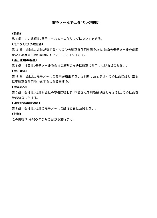 電子メールモニタリング規程 (目的) 第1条 この規程は,電子メールのモニタリングについて定める。 (モニタリングの実施) 第2条 会社は,会社が有するパソコンの適正な使用を図るため,社員の電子メールの使用状況を必要最小限の範囲においてモニタリングする。 (適正使用の義務) 第3条 社員は,電子メールを会社の業務のために適正に使用しなければならない。 (中止警告) 第4条 会社は,電子メールの使用が適正でないと判断したときは・その社員に対し,直ちに不適正な使用を中止するよう警告する。 (懲戒処分) 第5条 会社は,社員が会社の警告に従わず,不適正な使用を繰り返したときは,その社員を懲戒処分に付する。 (通信記録の非公開) 第6条 会社は,社員の電子メールの通信記録は公開しない。 (付則) この規程は,令和〇年〇月〇日から施行する。