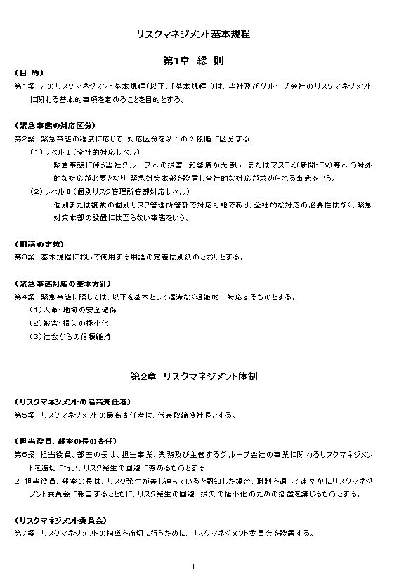 第1条 このリスクマネジメント基本規程(以下、「基本規程」)は、当社及びグループ会社のリスクマネジメントに関わる基本的事項を定めることを目的とする。