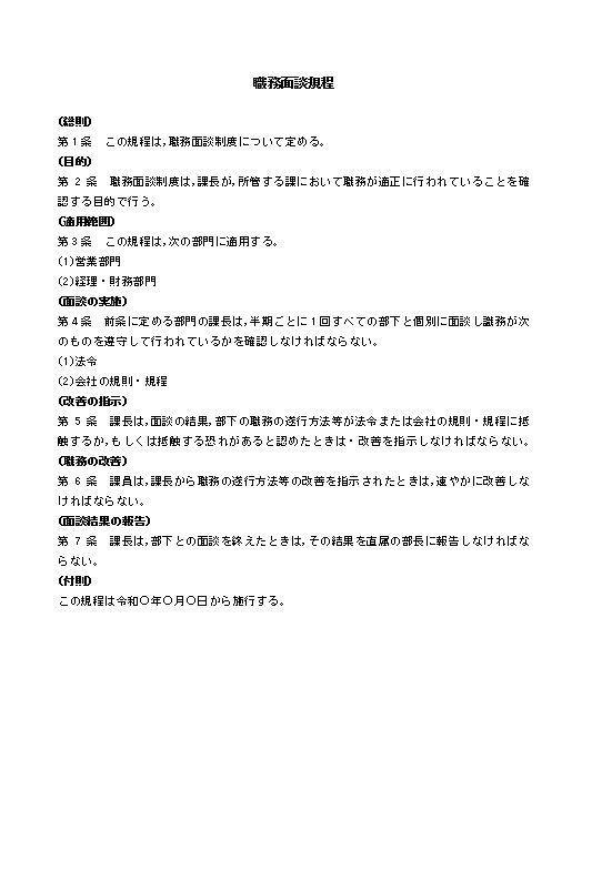 職務面談規程 (総則) 第1条 この規程は,職務面談制度について定める。 (目的) 第2条 職務面談制度は,課長が,所管する課において職務が適正に行われていることを確認する目的で行う。 (適用範囲) 第3条 この規程は,次の部門に適用する。 (1)営業部門 (2)経理・財務部門 (面談の実施) 第4条 前条に定める部門の課長は,半期ごとに1回すべての部下と個別に面談し識務が次のものを遵守して行われているかを確認しなければならない。 (1)法令 (2)会社の規則・規程 (改善の指示) 第5条 課長は,面談の結果,部下の職務の遂行方法等が法令または会社の規則・規程に抵触するか,もしくは抵触する恐れがあると認めたときは・改善を指示しなければならない。 (職務の改善) 第6条 課員は,課長から職務の遂行方法等の改善を指示されたときは,速やかに改善しなければならない。 (面談結果の報告) 第7条 課長は,部下との面談を終えたときは,その結果を直属の部長に報告しなければならない。 (付則) この規程は令和○年○月○日から施行する。