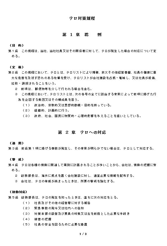 第1条 この規程は、当社、当社社員又はその関係者に対して、テロが発生した場合の対応について定める。