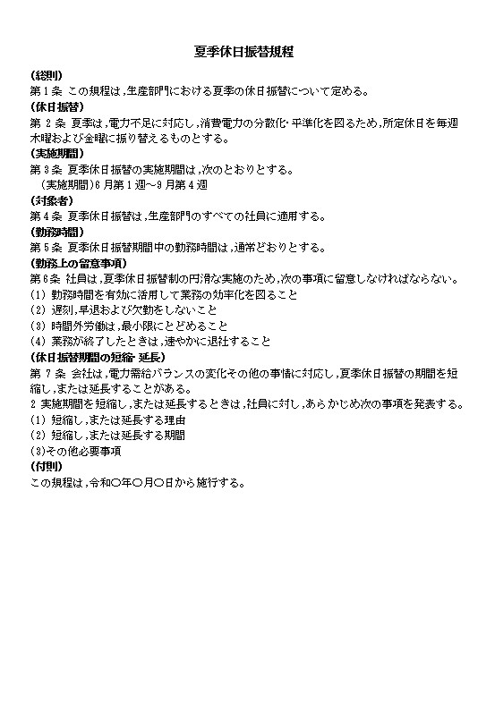 第2条 夏季は,電力不足に対応し,消費電力の分散化·平準化を図るため,所定休日を毎週木曜および金曜に振り替えるものとする。