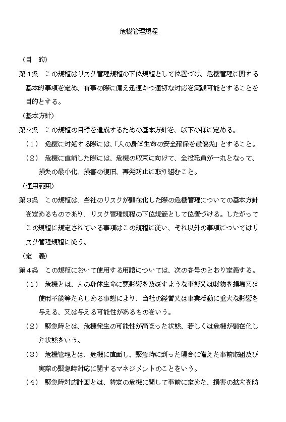 第1条 この規程はリスク管理規程の下位規程として位置づけ、危機管理に関する基本的事項を定め、有事の際に備え迅速かつ適切な対応を実践可能とすることを目的とする。