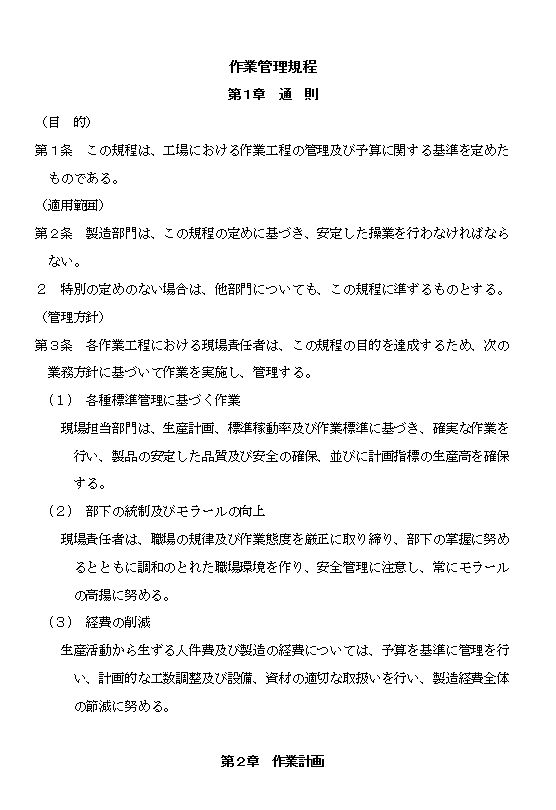 第1条 この規程は、工場における作業工程の管理及び予算に関する基準を定めたものである。